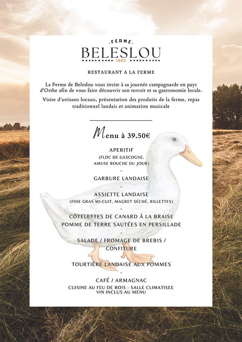 La Ferme de Beleslou vous propose une journée en plein cœur du Pays d’Orthe afin de vous faire découvrir son terroir et sa gastronomie locale. Menu du terroir et ANIMATION MUSICALE le midi et sur réservation uniquement au 05 58 73 18 92